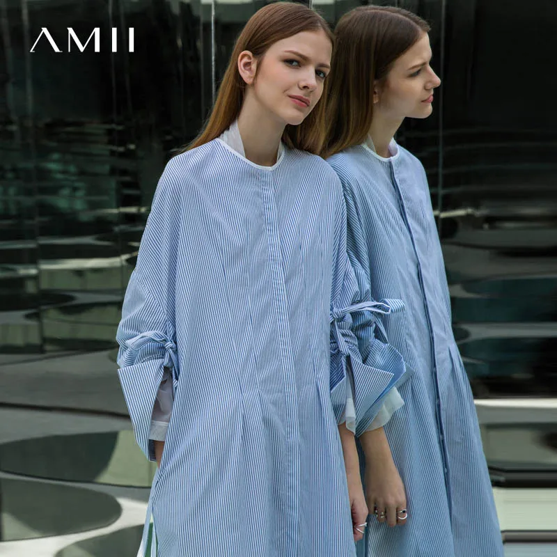 Amii минималистичное платье в полоску, Осеннее женское платье средней длины с круглым вырезом, 11877682