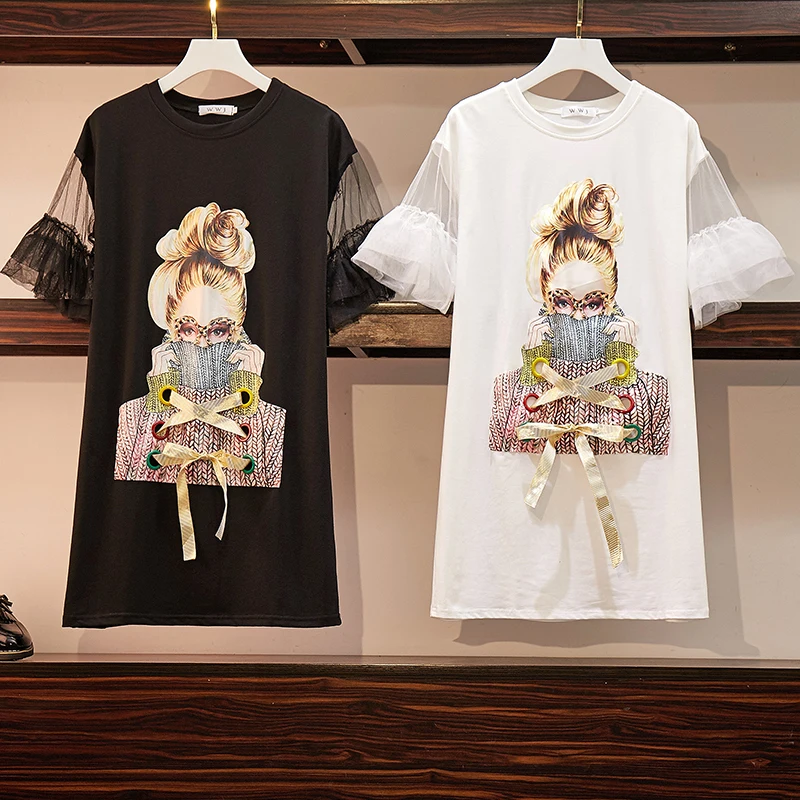 Женская футболка размера плюс, платья 2020, модная уличная одежда, очки для девушек, с принтом, сетчатые Лоскутные Платья с расклешенными рукавами, S-4XL
