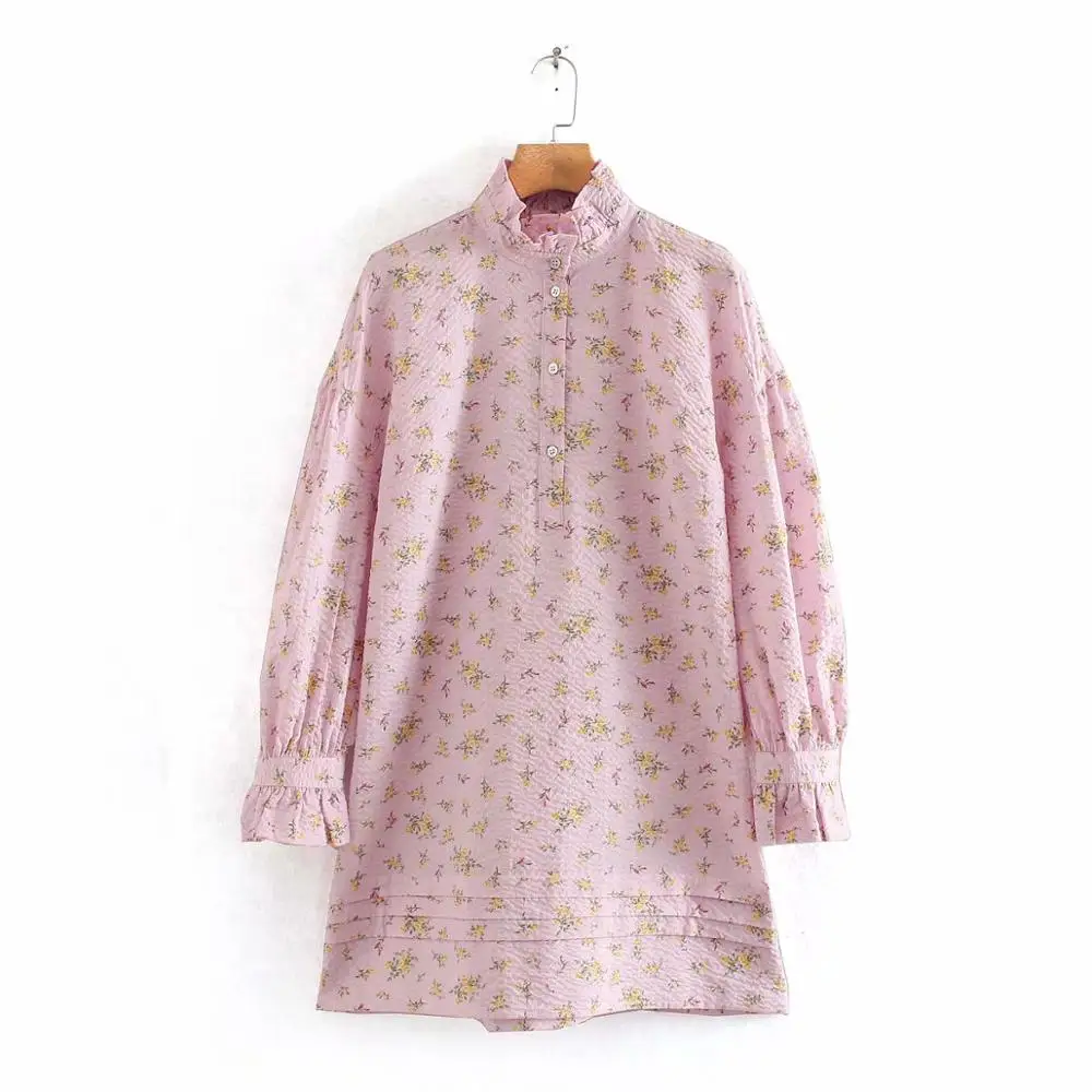Женское милое кружевное платье-рубашка с воротником-стойкой и цветочным принтом, повседневное розовое платье-рубашка с пышными рукавами, шикарные платья DS3477