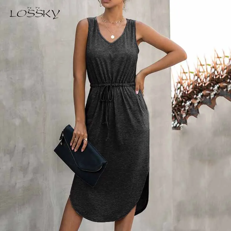 Lossky летнее платье женское повседневное с v-образным вырезом без рукавов, тонкое однотонное простое платье без рукавов с рюшами, одежда до ко...