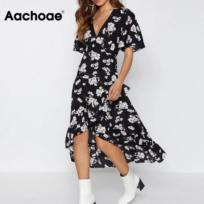 Для женщин богемский Цветочный принт шифоновое платье сексуальное летнее пляжное платье Повседневное v-образный вырез с коротким рукавом Вечерние платья Открытое платье без рукавов