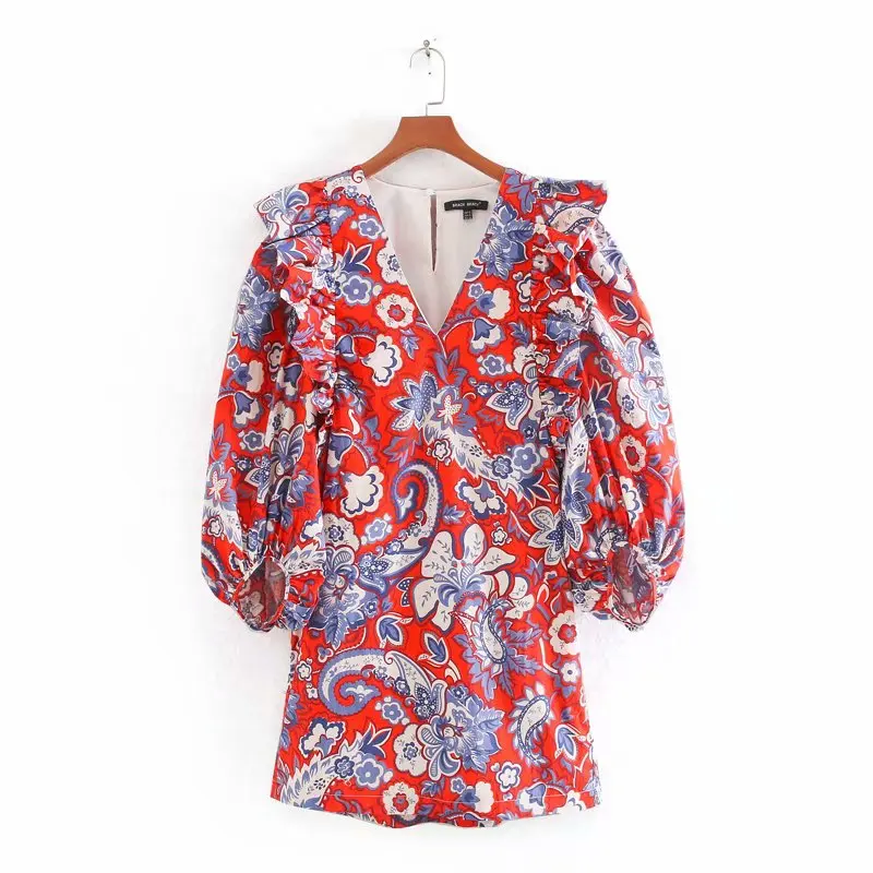 Новинка, женское элегантное мини-платье с v-образным вырезом и цветочным принтом пейсли, женское плиссированное платье с рукавами-фонариками и оборками DS3404