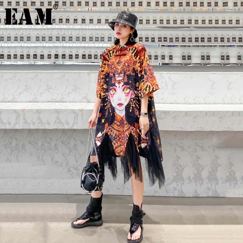[EAM] женское Сетчатое платье большого размера с принтом, новинка, воротник-стойка, рукав три четверти, свободный крой, мода весна-лето 2020, 1T080