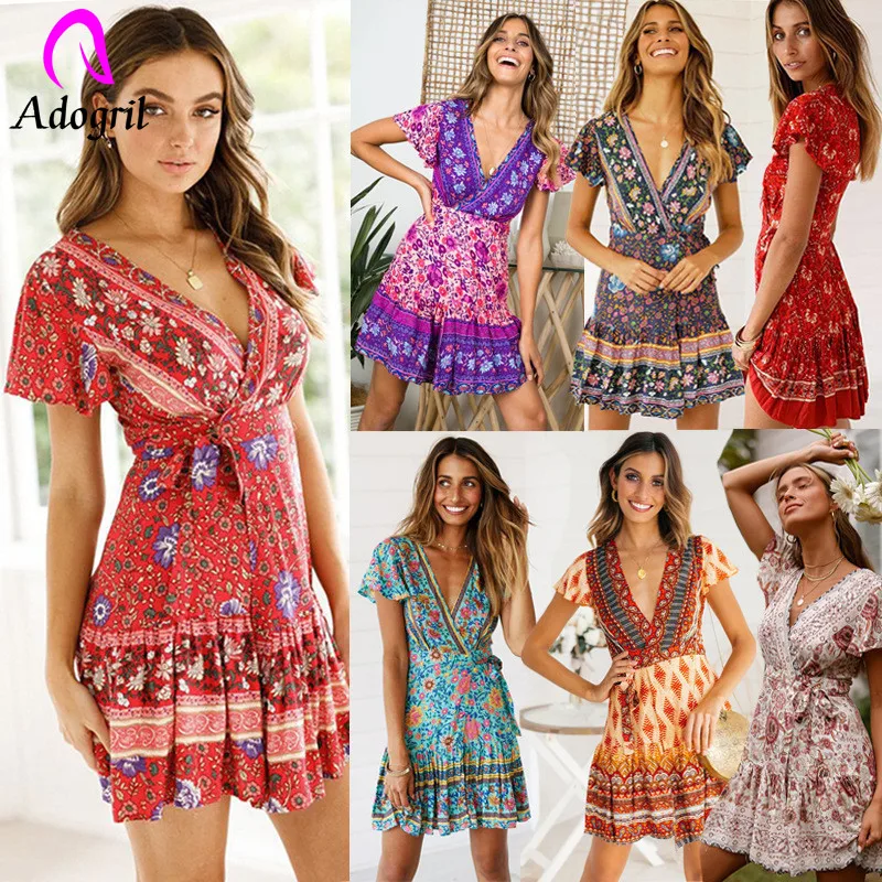 Богемное платье с v-образным вырезом и коротким рукавом, многослойное платье с цветочным принтом, летнее яркое мини-платье, новое Цветочное платье для леди