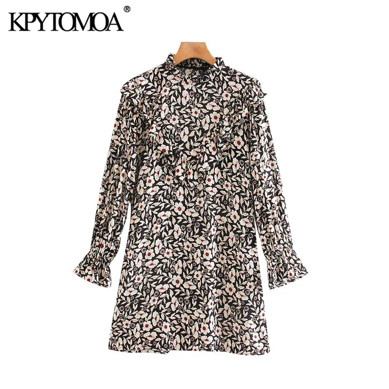 Женское винтажное плиссированное платье с цветочным принтом, весна 2020, Модное пышное облегающее платье с длинным рукавом, женские сексуальные мини-платья с высоким воротником