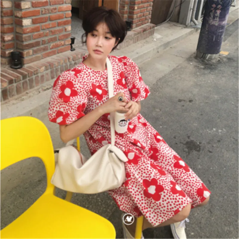 RUGOD 2020 Новое поступление корейское шикарное красное летнее платье с цветочным принтом женские платья с круглым вырезом и пышными рукавами