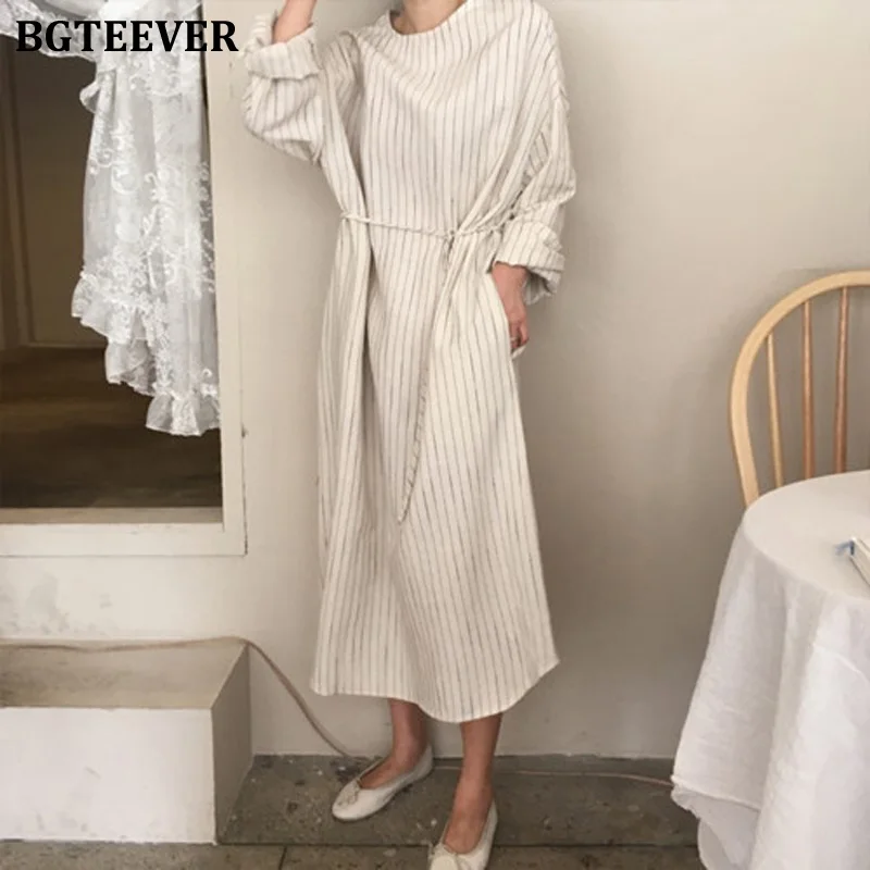 BGTEEVER повседневное свободное женское платье в Вертикальную Полоску с круглым вырезом женское платье с длинным рукавом 2019 осеннее платье с п...