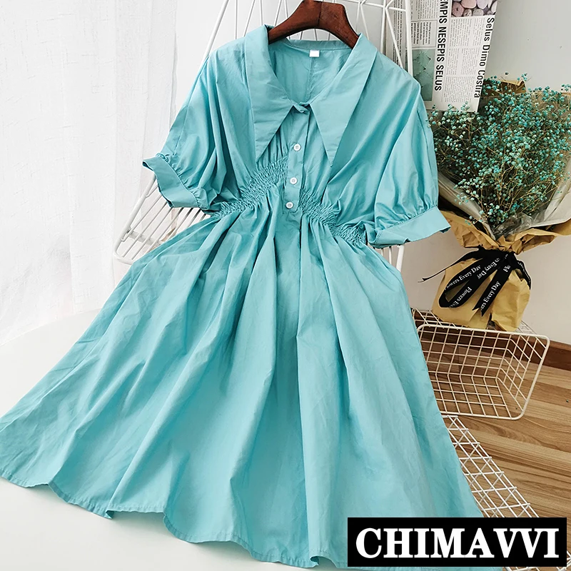 2020 летнее Новое однотонное фиолетовое платье с пышными рукавами для студентов, милое женское свободное повседневное классическое платье-рубашка