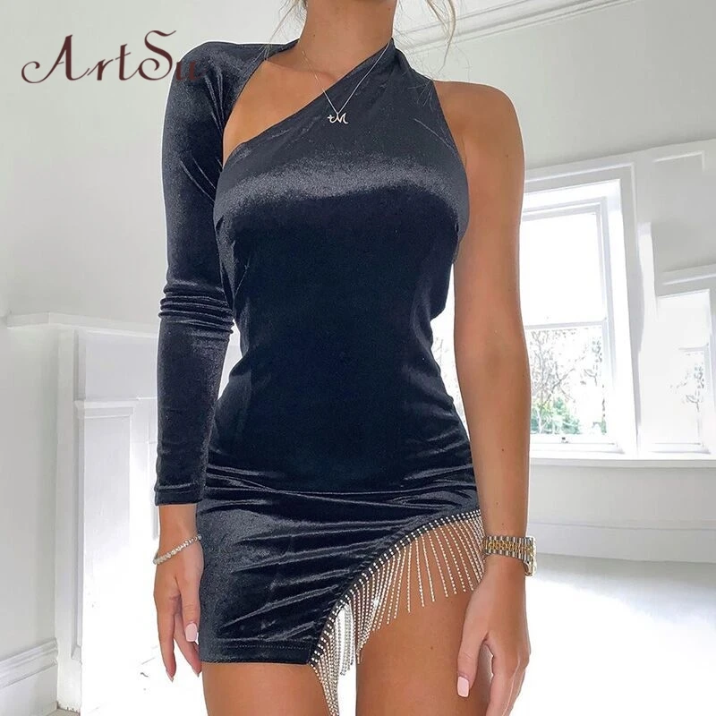 Artsu/мини-платье на одно плечо с длинным рукавом, бархатное, с кисточками, в стиле пэчворк, сексуальные, вечерние, для клуба, для женщин, для выпускного вечера, модная одежда ASDR7166