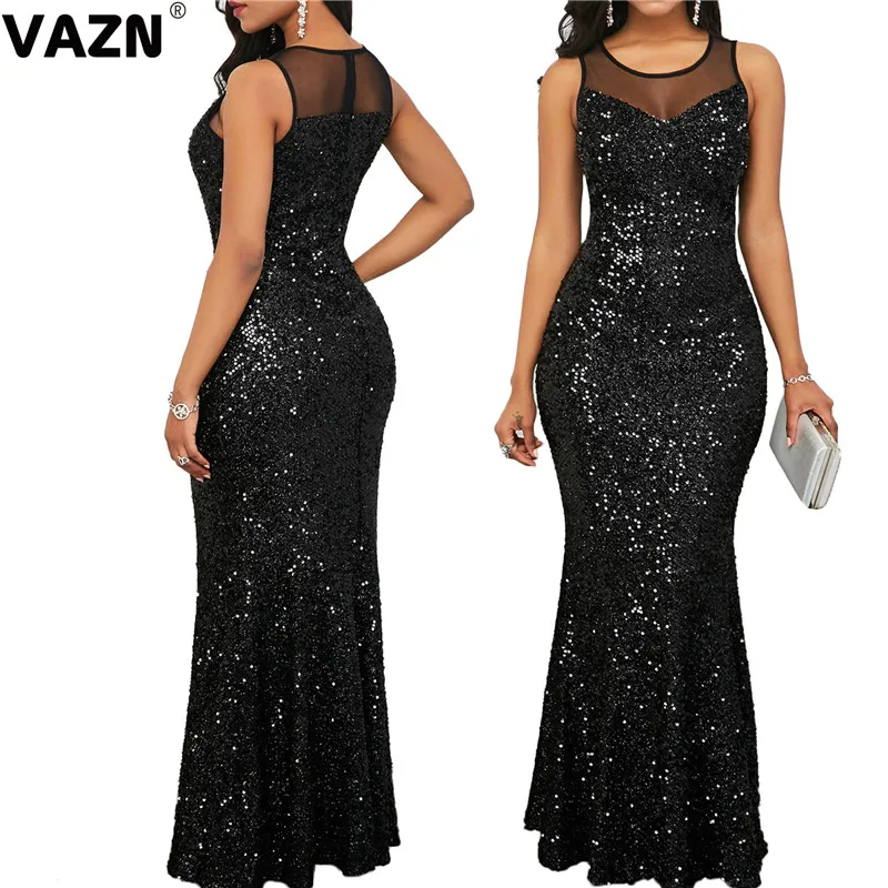 VAZN Черное Кружевное облегающее платье без рукавов, новинка 2020, Модные Повседневные Вечерние длинные платья с завязками, сексуальное тонкое ...
