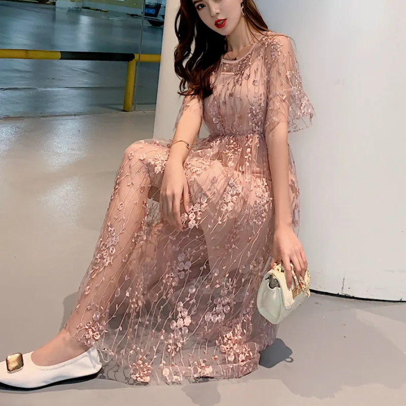 Летнее женское платье из тюля с коротким рукавом, милое женское кружевное платье с вышивкой, женское Сетчатое платье с коротким рукавом