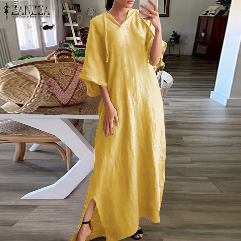 ZANZEA большого размера Летнее Длинное платье с капюшоном для женщин длинное макси Vestidos повседневное хлопковое одноцветное платье с карманам...