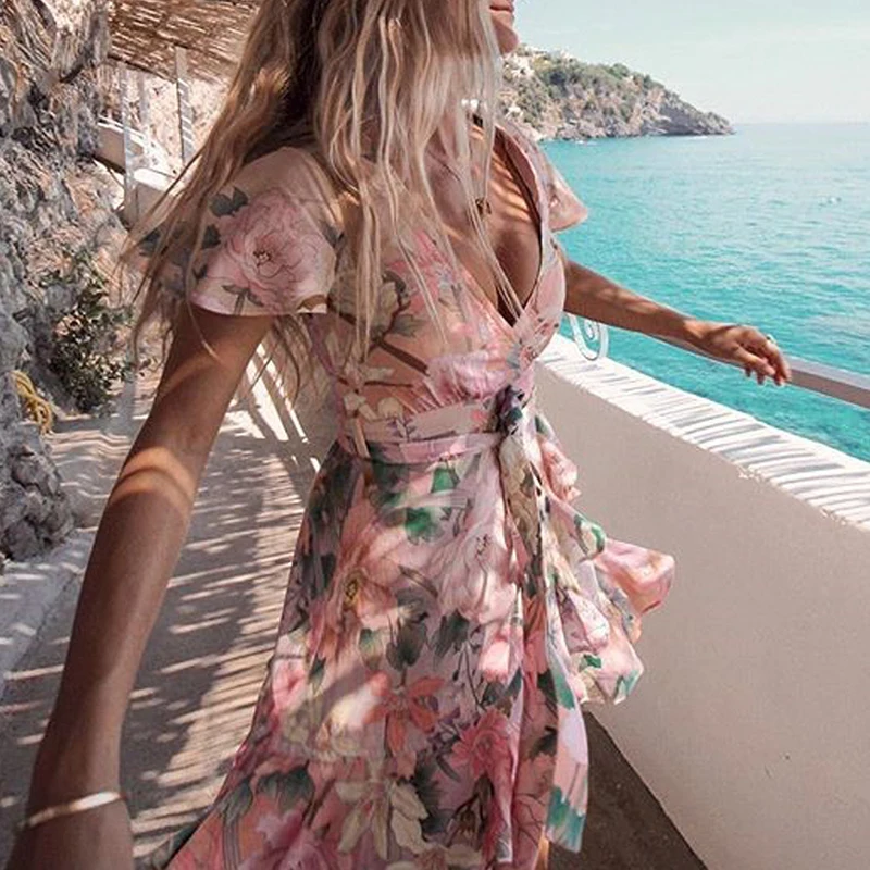 Lessverge Элегантный boho женские туфли с цветочным принтом летнее платье платья с v-образным вырезом оборками Хлопок Короткое пляжное платье Пра...