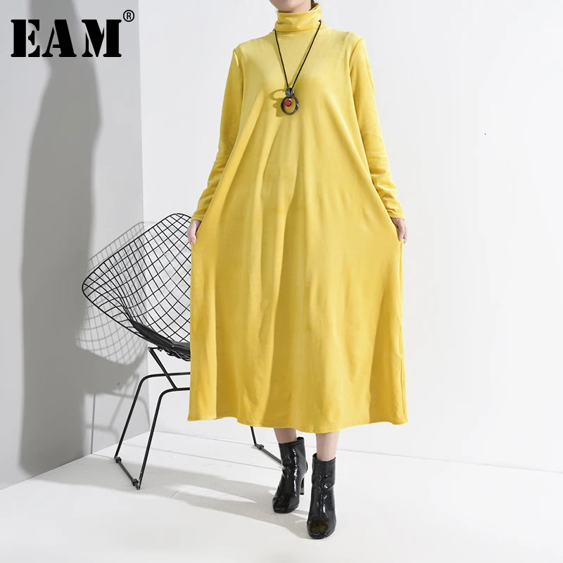 [EAM] женское Желтое Короткое длинное вельветовое платье большого размера, новинка, водолазка с длинным рукавом, свободный крой, мода, весна-о...