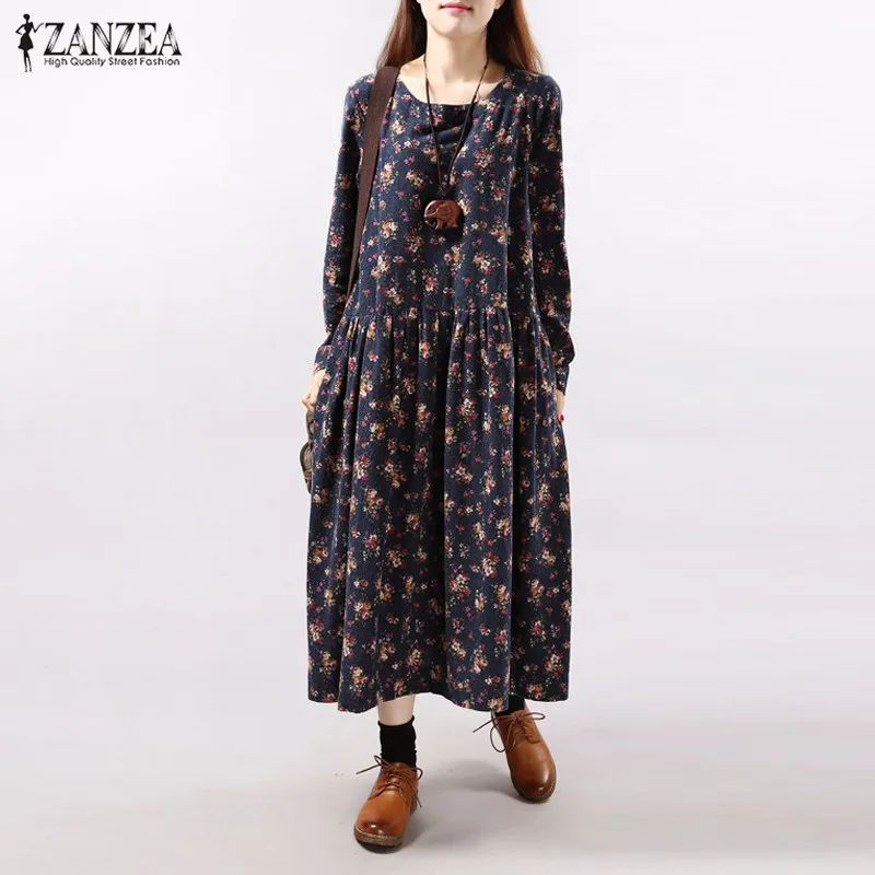Платья 2019 осень ZANZEA женское винтажное цветочный принт платье с длинным рукавом O шеи Карманы Свободные повседневные до середины икры Vestidos п...