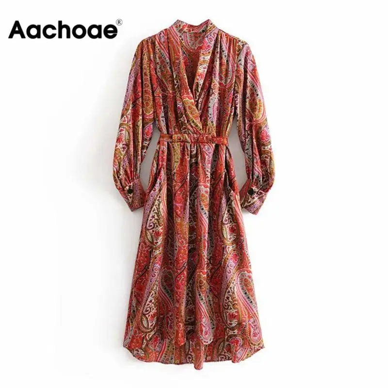 Сексуальное длинное платье с глубоким v-образным вырезом и цветочным принтом, Женские винтажные вечерние платья миди с длинными рукавами, п...