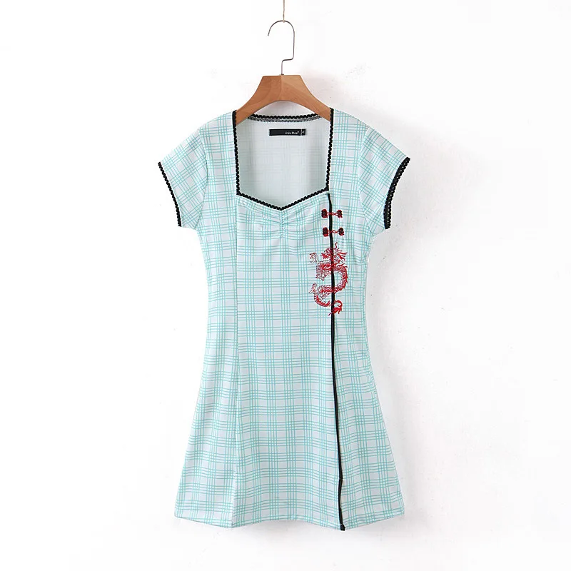 Женское платье-рубашка 2020, с высокой талией, розовое, синее, миди, Vestidosx, короткий рукав, а-силуэт, кавайное, летнее платье, вышивка дракона, ...