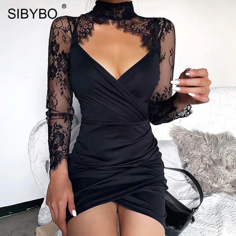 SIBYBO кружевное вязанное крючком Плиссированное сексуальное облегающее платье, модное мини-летнее женское платье с v-образным вырезом, черные Клубные Короткие вечерние платья