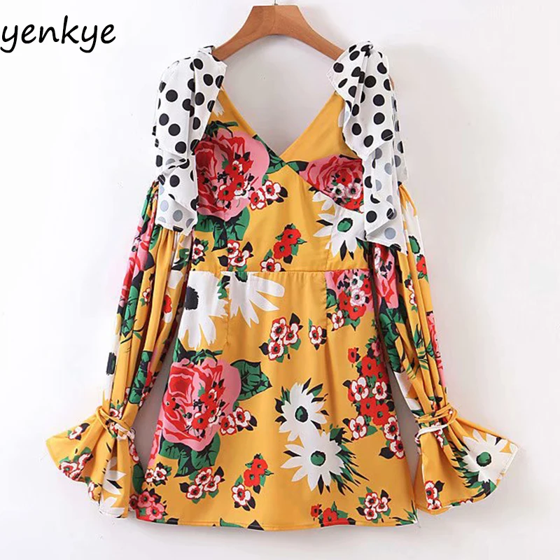 Цветочный принт, праздничное платье для женщин, с завязками на плечах, с v-образным вырезом, с длинным рукавом, летнее платье, сексуальное женское ТРАПЕЦИЕВИДНОЕ Мини шифоновое платье, короткое