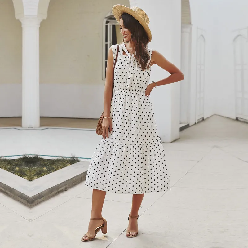 Платье в горошек на весну и лето, повседневное Хлопковое платье на шнурках без рукавов, 2020