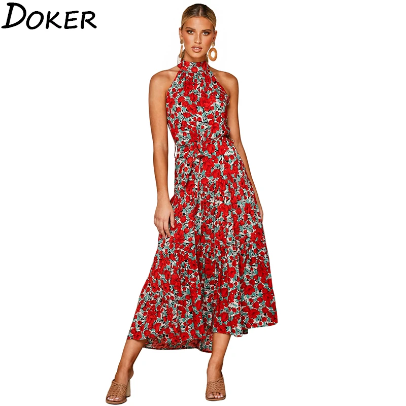 Женское Повседневное платье средней длины, длинное пляжное платье с цветочным принтом и поясом, элегантные вечерние платья без рукавов, 2020