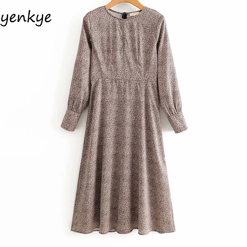 Весна 2020, женское винтажное леопардовое платье с длинным рукавом, Дамское ТРАПЕЦИЕВИДНОЕ Повседневное платье средней длины с круглым вырез...