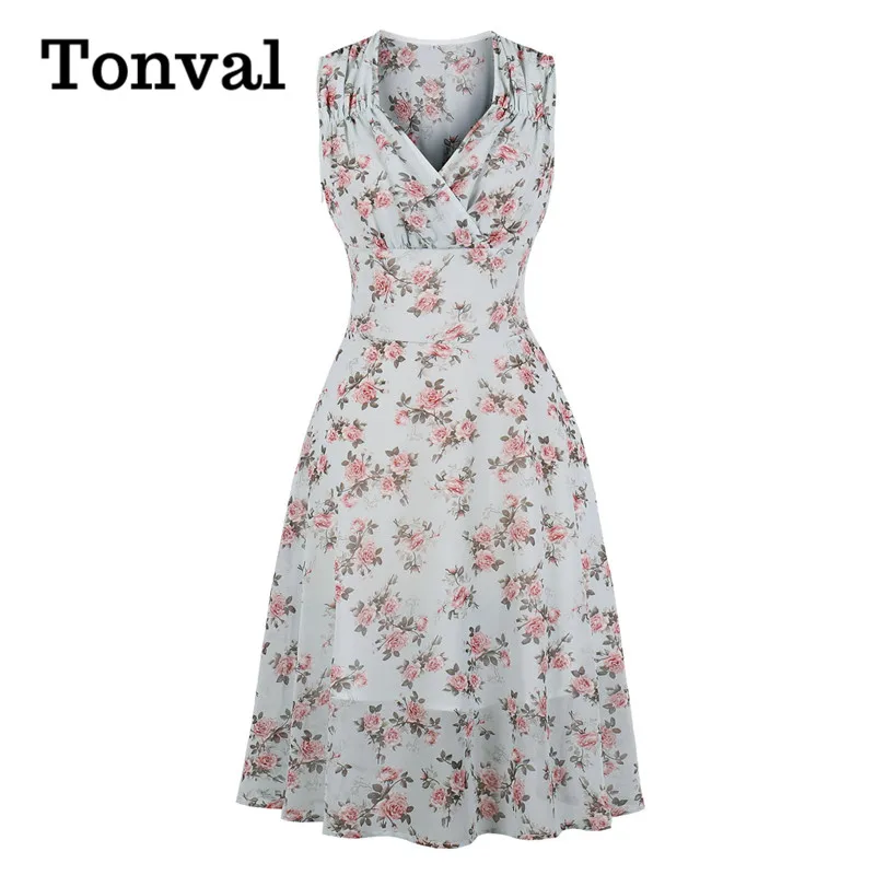 Tonval винтажное шифоновое платье с высокой талией и v-образным вырезом, Повседневное платье с запахом, женское летнее элегантное платье для отпуска, ТРАПЕЦИЕВИДНОЕ ПЛАТЬЕ МИДИ