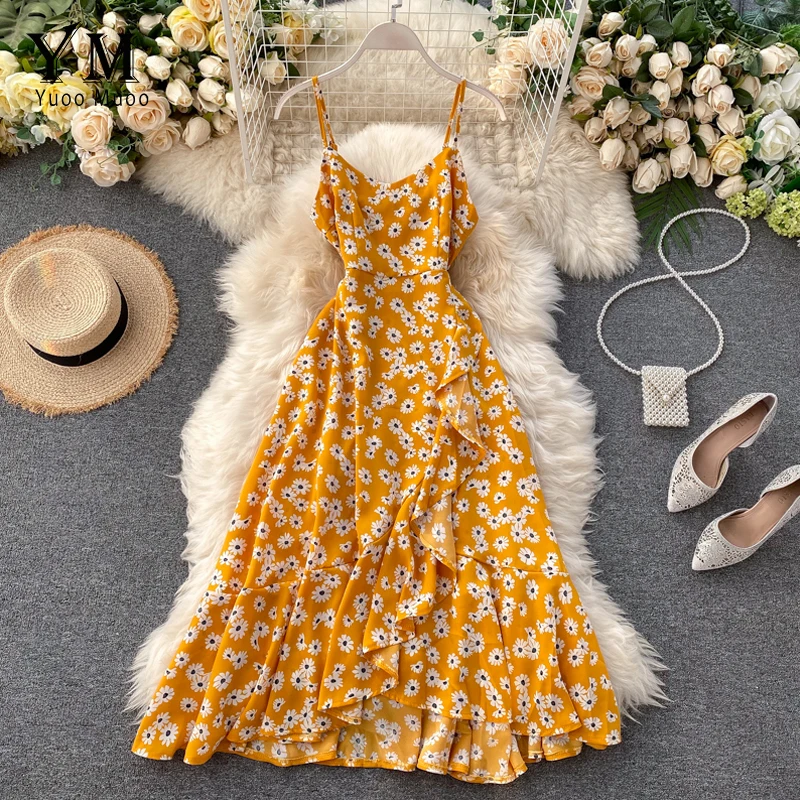 Женское длинное платье на бретельках YuooMuoo, летнее платье макси с оборками и цветочным принтом, праздничные платья