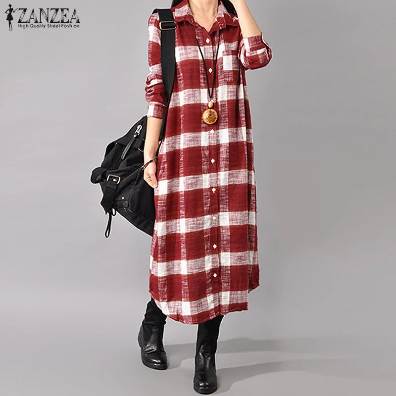 2019 клетчатый плед рубашка Vestido ZANZEA Для женщин нагрудные с длинным рукавом длинное платье Повседневное кнопки вниз хлопок сарафан-Туника хал...