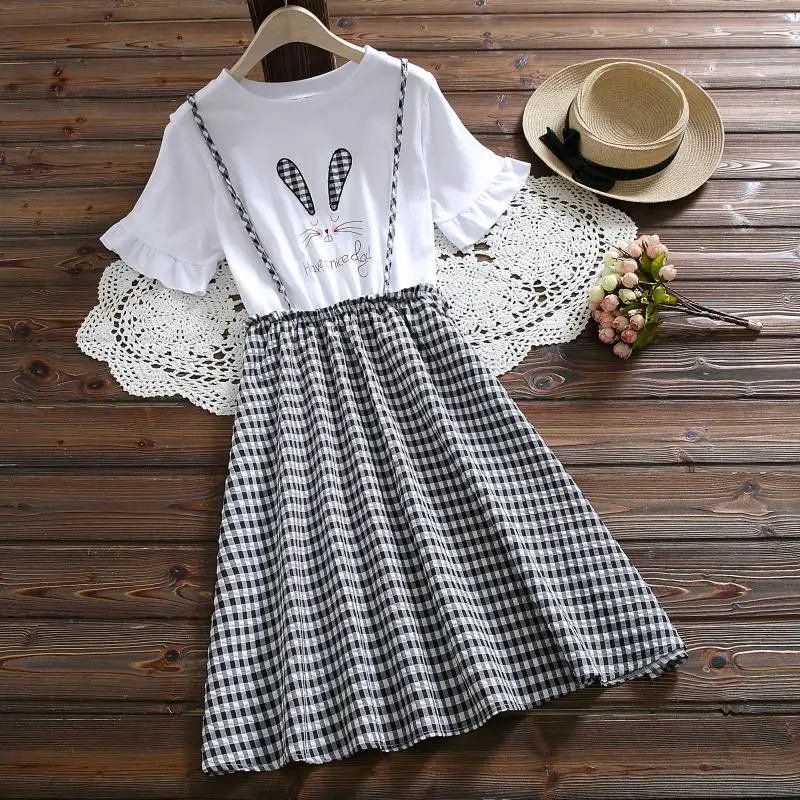 Летнее платье, имитация двух частей, бретели с вышивкой, короткий рукав, Kawaii, женские платья в японском стиле