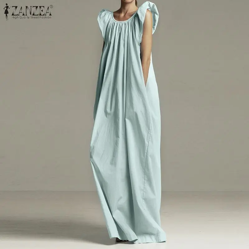 ZANZEA 2020 Summer Ruffles Dress Women Sleeveless Sundress Elastic O Neck Cotton Pockets Kaftan Robe Dress Long Maxi Vestidos 7