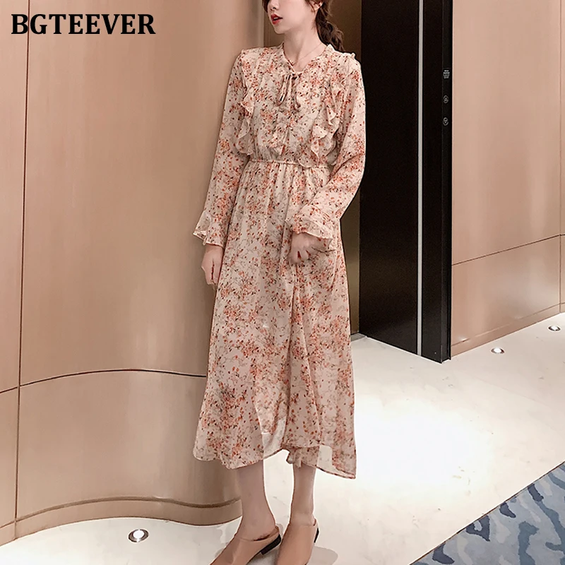 BGTEEVER, весеннее шифоновое платье с круглым вырезом, женское платье со шнуровкой и оборками, эластичное, с высокой талией, с цветочным принтом, а-силуэт, Vestidos Femme