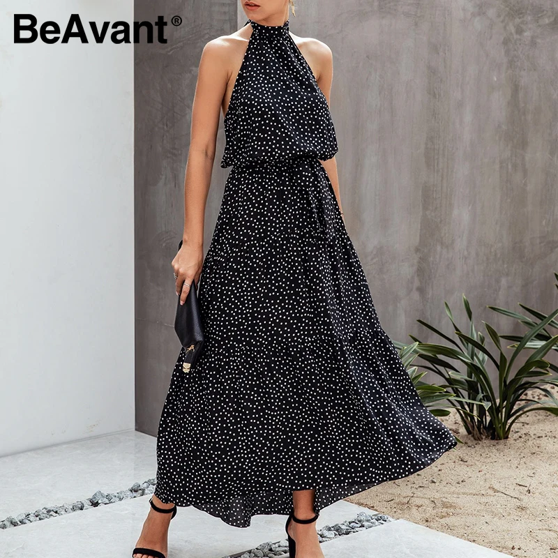 BeAvant винтажное длинное платье в горошек с лямкой на шее, женское летнее платье без рукавов, богемное макси платье, Пляжное женское платье с открытой спиной и оборками, Халат