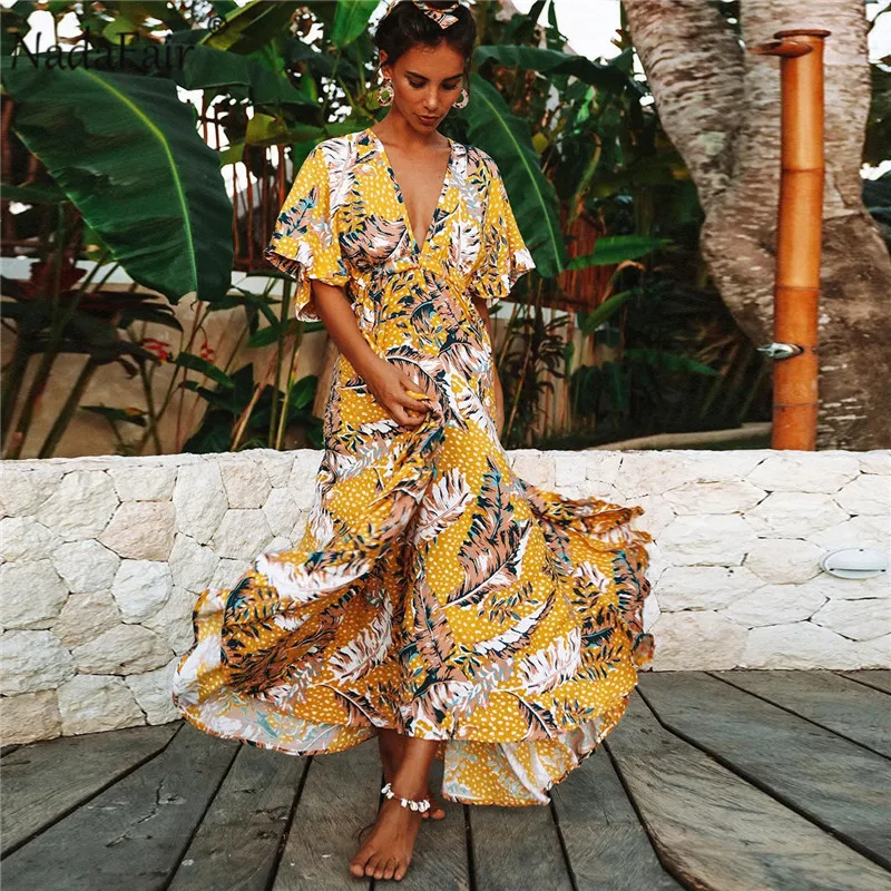 Женское платье макси Nadafair, летнее пляжное платье с коротким рукавом, v-образным вырезом, открытой спиной и цветочным принтом