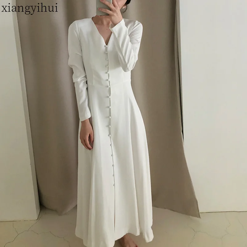 Повседневные белые платья для женщин, элегантное модное вечернее платье с длинным рукавом, сексуальное однобортное платье с высокой талией, ТРАПЕЦИЕВИДНОЕ плиссированное платье