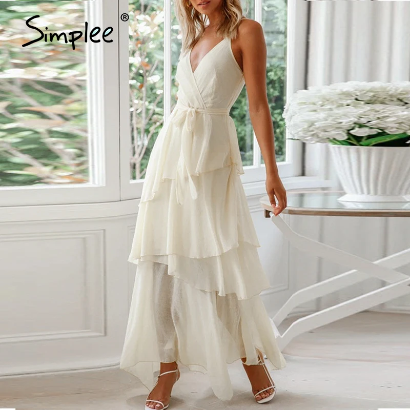 Женское вечернее платье без рукавов Simplee, однотонное платье с рюшами и высокой талией, летнее платье с v-образным вырезом, уличное платье с рюшами, вечернее платье Макси