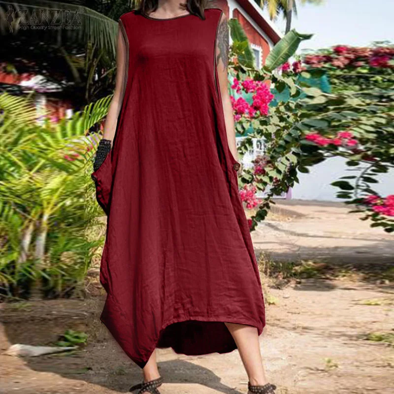 2020 летнее хлопковое льняное платье ZANZEA, элегантное женское пляжное платье без рукавов, повседневный свободный однотонный вечерний сарафан, Vestido, сарафаны, кафтан 7