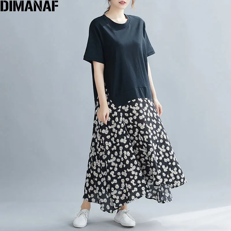 Летние платья DIMANAF, Пляжное Платье размера плюс, хлопковый женский сарафан, свободное платье с цветочным принтом, женское Повседневное платье черного цвета