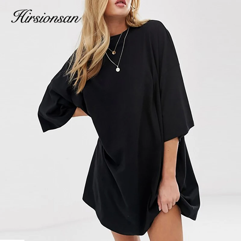 Hirsionsan, хлопковая футболка, платья для женщин, лето-осень 2020, корейское однотонное сексуальное мини-платье, прямое женское платье, свободные платья для девочек