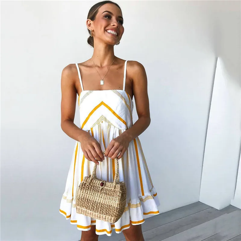Летнее женское платье для отпуска, модное Полосатое платье без рукавов с ремешками, прямые свободные Мини платья, женские сарафаны, новинка 2019