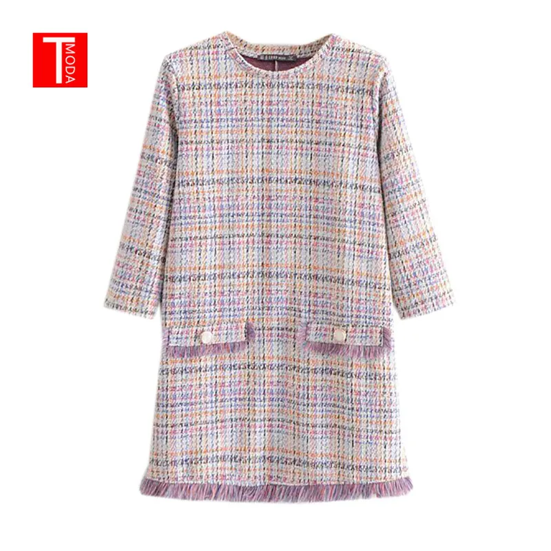 Для женщин Элегантный твидовый плед мини-платье Ленточки с рукавом три четверти с круглым вырезом женские Повседневное модные шикарные пла...