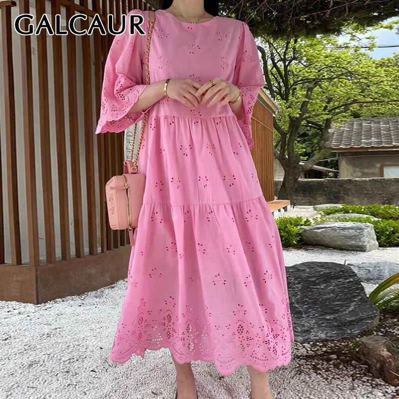 Женское ажурное платье с круглым вырезом GALCAUR, корейское элегантное платье средней длины с коротким рукавом в стиле пэчворк, летняя мода 2020