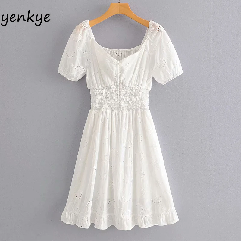 Сексуальное ажурное платье с вышивкой, женское летнее платье с коротким рукавом и v-образным вырезом, Современное женское мини-платье трапециевидной формы с эластичной талией, белое праздничное платье
