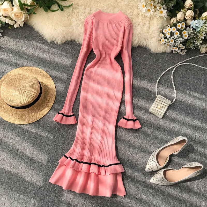 2020 облегающее осеннее платье с оборками, зимнее Облегающее вязаное платье-свитер, платье-Русалка средней длины, вечерние женские повседнев...