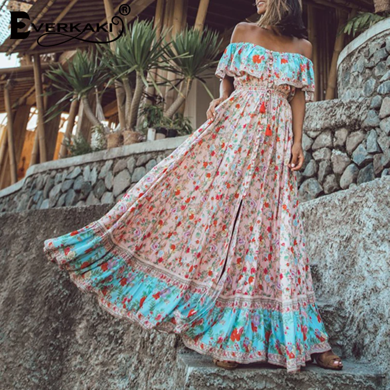 Everkaki без рукавов с открытыми плечами платья для женщин для Богемный Цыганский Макси платье цветочный длинное платье с принтом Лето 2019