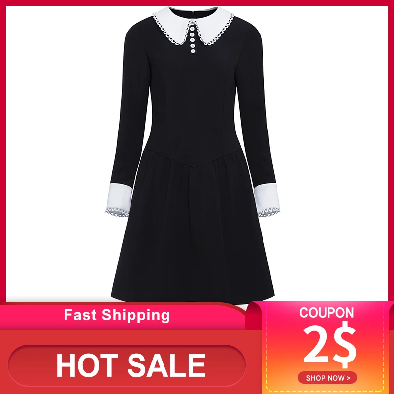 Готическое платье черного цвета, женское осеннее ТРАПЕЦИЕВИДНОЕ ПЛАТЬЕ с воротником Питер Пэн, приталенное уличное модное элегантное платье в стиле ретро, консервативный дизайн, зимние платья