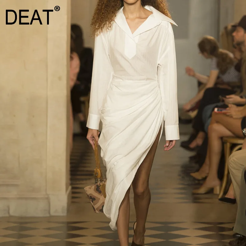 Женское платье с отложным воротником DEAT, асимметричное хлопковое платье с длинными рукавами, весна-лето 2020, WE342