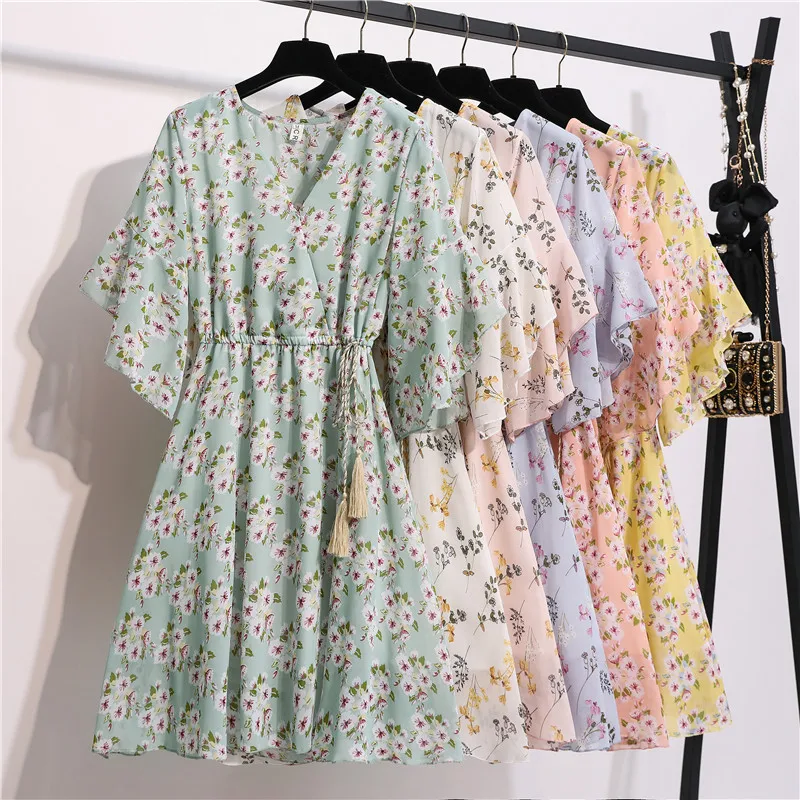 Летнее шифоновое платье с v-образным вырезом и оборками на рукавах, милое эластичное элегантное женское платье с цветочным принтом, с подкладкой, 2020