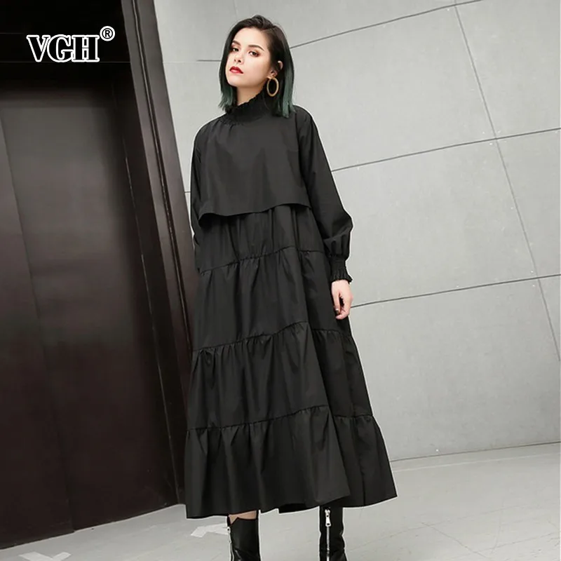 VGH 2019 осень Платье черного цвета для Для женщин Свободные Большой Размеры эластичный воротник с длинным рукавом Для женщин платья 2019 Мода Но...