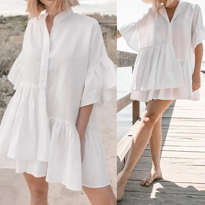 Женское платье с оборками, большие размеры, лето 2019, свободные, однотонные, женские пляжные платья, повседневные, на пуговицах, сексуальные, ...